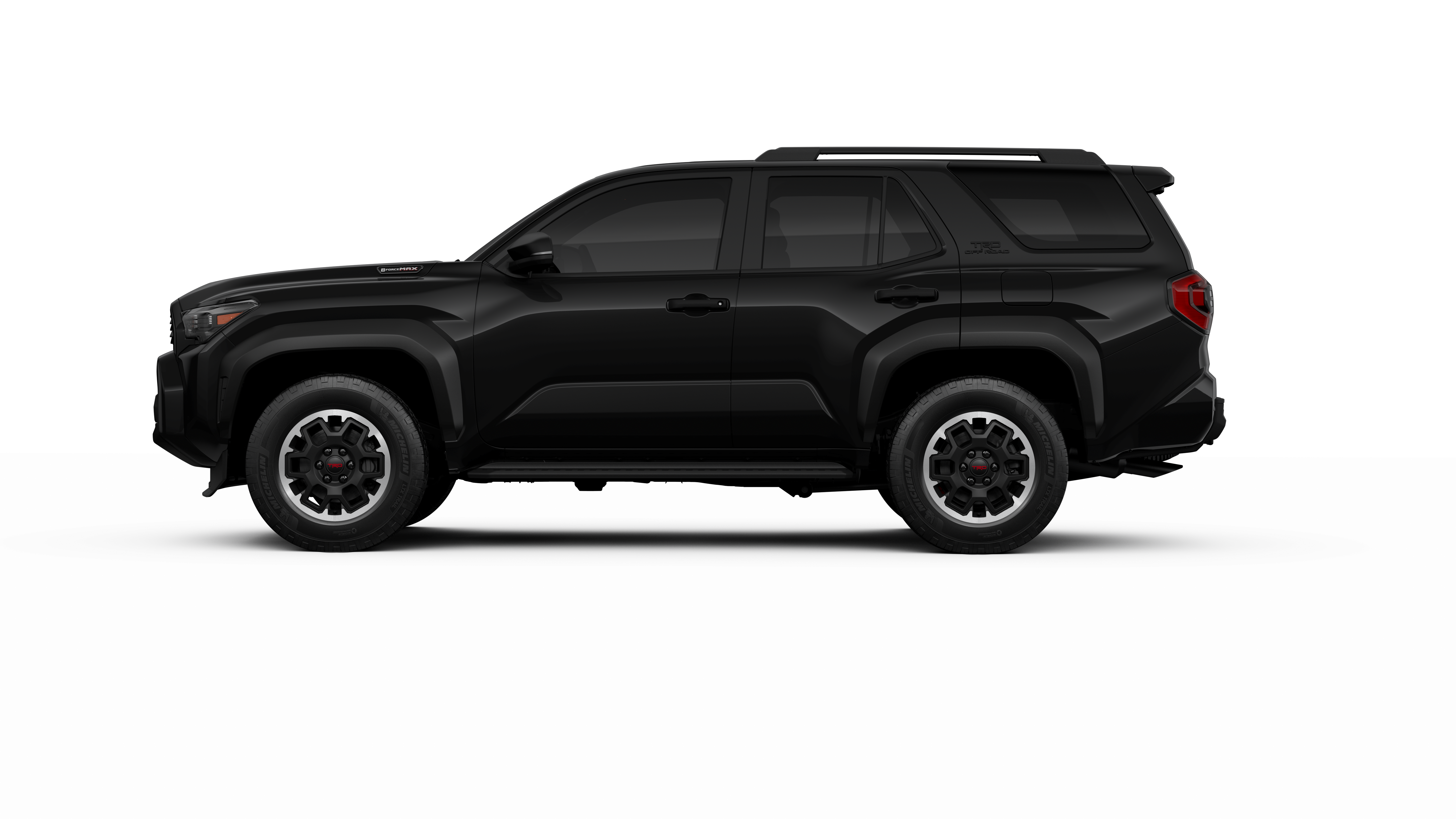 - Black honeycomb-style grille, mirror caps, door handles, and overfenders; color-keyed rear spoiler; black "TRD OFF ROAD" and "4RUNNER" badges